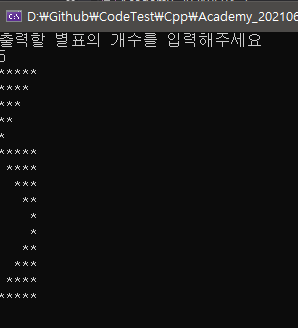 for (int i = star; i > 0; i--) cout << string((star - i), ' ') << string(i, '*') << endl;'간단한 프로그램' 카테고리의 다른 글