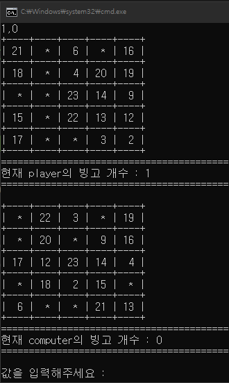 - 플레이어와 컴퓨터가 돌아가면서 1개의 숫자를 말하고 5개의 숫자가 가로 세로 혹은 대각선에 있을시 빙고
